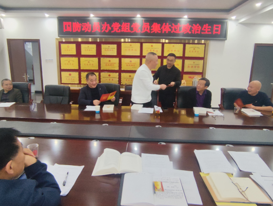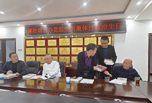 上饶市广丰区国防动员办党组书记、主任、机关党支部书记俞书炎主持会议并向每位党员赠送党员政治生日贺卡和《习近平在福建》《习近平在浙江》《落实中央八项规定精神规范手册》等书籍作为政治生日礼物。