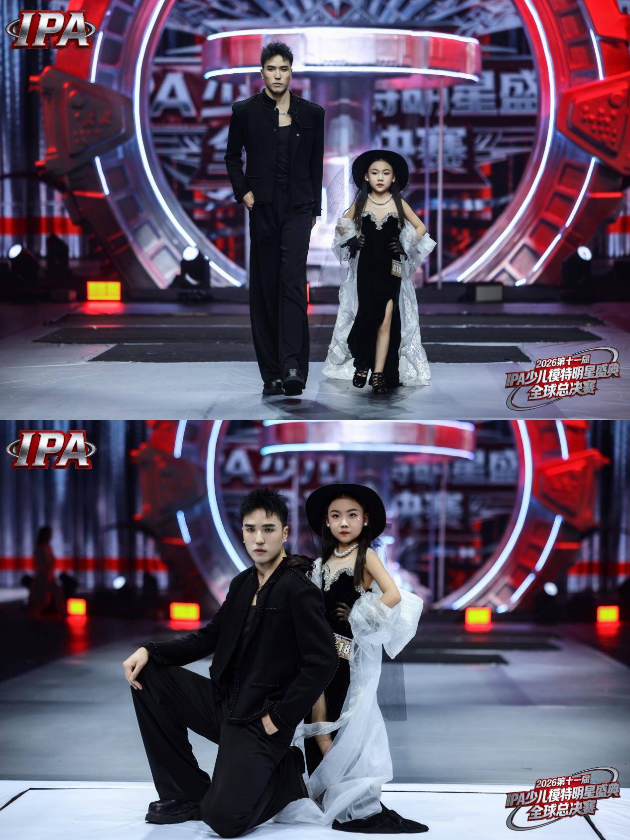 在「师生秀」环节中,她身着黑色丝绒开叉礼服搭配宽檐礼帽,与老师并肩登台,二人步伐高度同步、眼神交流默契十足,在未来感舞台背景下,尽显超越年龄的专业度与强大气场,成为全场最亮眼的组合。