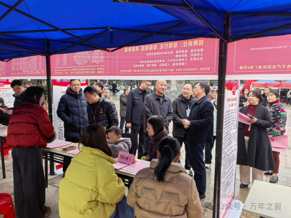 为落实省、市人社部门“春风行动”暨就业援助季工作要求,万年县于2月25日至26日举办“赣就有位来”线上线下专场招聘会,县相关领导到场指导。本次招聘会以锦湖公园为主会场,市民中心、一眼万年广场、润丰广场等点位及各乡镇就业之家设分会场,县乡村三级同步联动,聚焦重点群体就业需求,搭建企业与求职者高效对接平台,助力县域高质量充分就业。